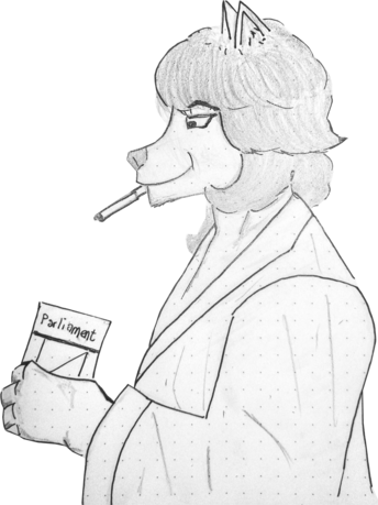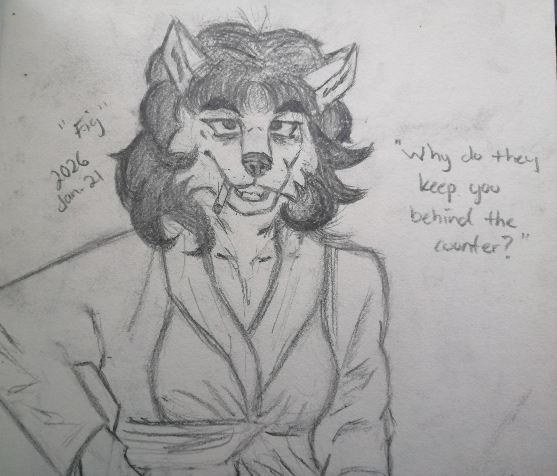 I made Fig on the 21st of January, 2026. She is the crown jewel of my work. I made her that afternoon while outlining a canine anthro, and got ahead of myself by giving her a vintage hairstyle with the sketch. When going over the sketch with a darker pencil, I went too hard on her eyes, and it looked like she had bags under them. She looked middle-aged already, so I gave her a cig and a couple light wrinkles. You can't be middle aged without a bathrobe, so I drew that on her to finalize the image.